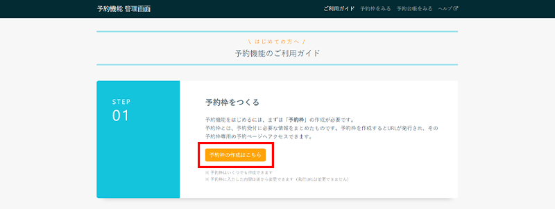 クリックすると「予約機能 管理画面」に進むので、STEP01の中にある「予約枠の作成はこちら」というボタンをクリック。