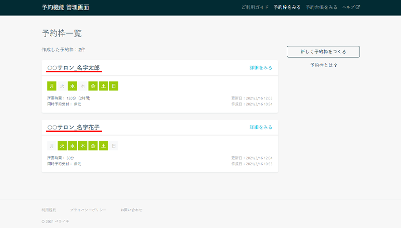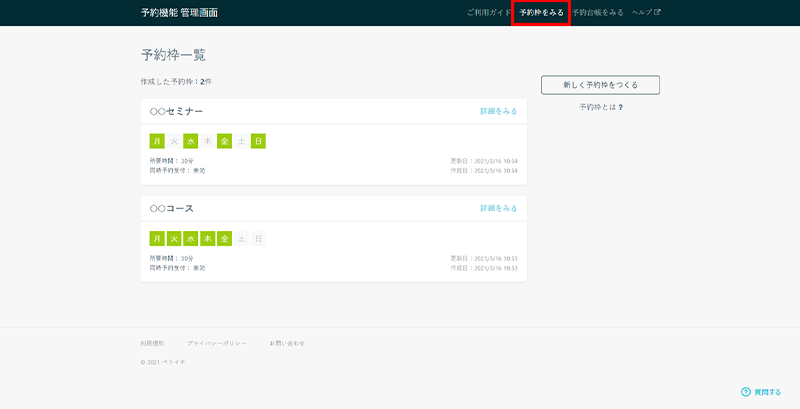▲「予約枠をみる」をクリックすると作った予約枠が一覧で見られます