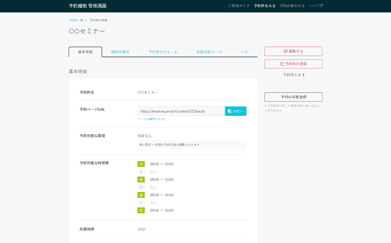 クリックした先では、予約枠名などの基本情報や予約可能日時、予約時に必要な入力項目の設定などができます。予約内容に合わせて入力項目を埋めましょう!