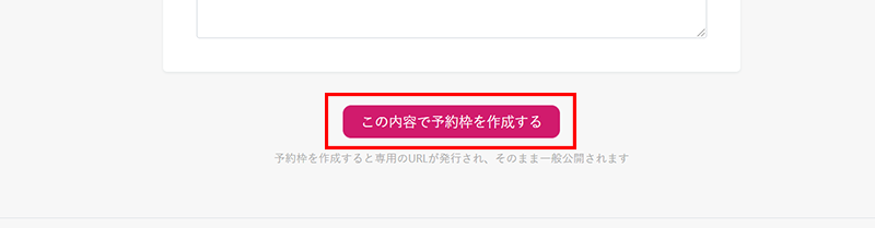 必要項目をすべて記入したら、一番下にある「この内容で予約枠を作成する」ボタンをクリック。