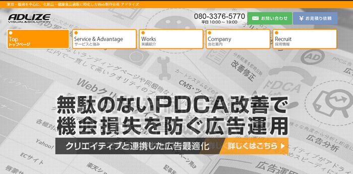 株式会社アドライズは、化粧品と健康食品の通販に特化し、年間300以上のランディングページを制作する会社です。