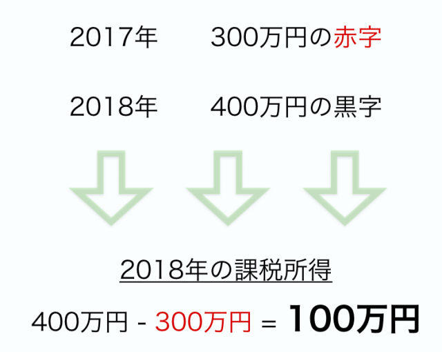 例を出すと2017年に300万円の赤字を計上して、翌年2018年には400万の黒字が出たとします。その場合、前年の赤字(300万円)を2018年の所得(400万円)から差し引くことができるので、2018年の確定申告における課税所得は100万円となります。