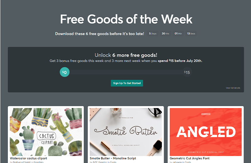 その中で、毎週6つのイラストやアイコンなどの素材やテンプレートを、1週間のみ無料でダウンロードできるFree Goods of the Weekというものが行われています。高品質でおしゃれな素材ばかりなので、毎週チェックしてみると良いかもしれません。