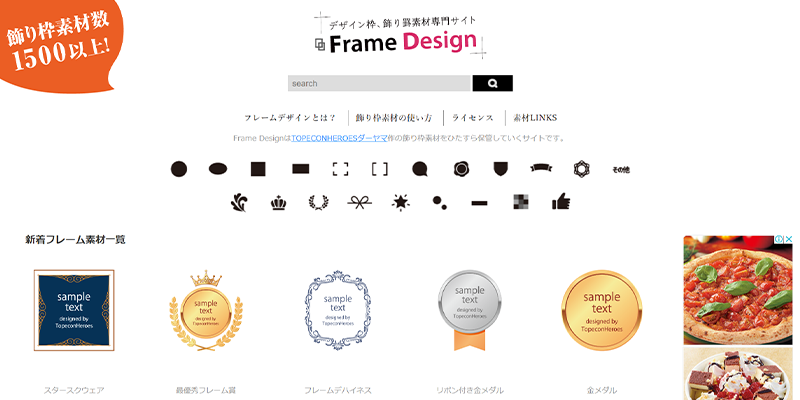 フレーム専門の素材サイトです。カテゴリーのほか、丸や四角、楕円など、フレームの形状で絞り込むこともできます。