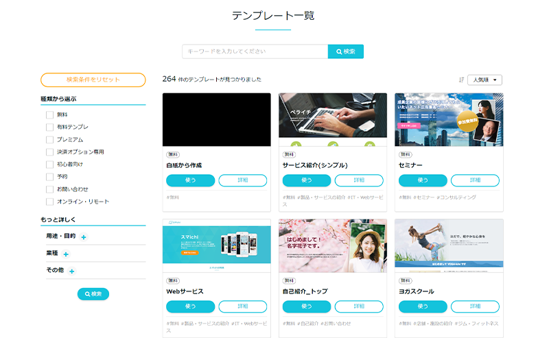 ▲260種以上のテンプレートの中から使いたいものを選んで編集・公開するだけ