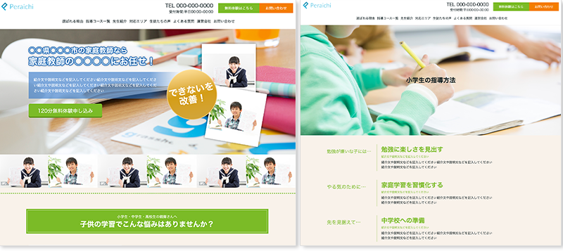 サービスの強みやコース紹介、教師紹介など家庭教師用のホームページテンプレートです。