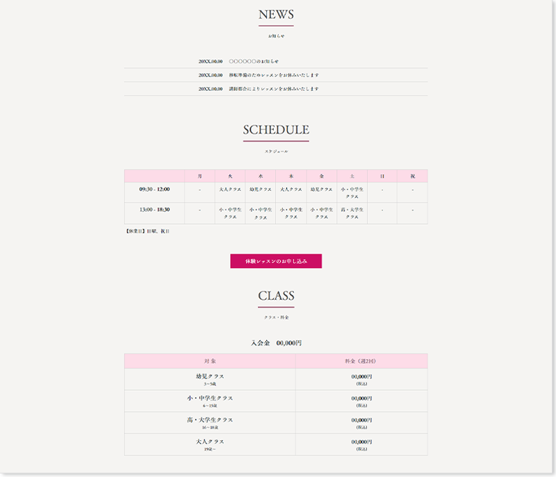 女性向けのかわいらしい色と雰囲気が特徴のテンプレートで、バレエ以外の分野のスクールのホームページとしてもご活用いただけます。