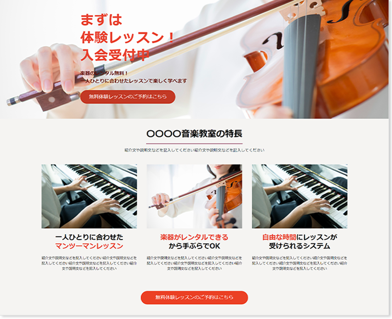 教室の特徴やコースやクラスの紹介まで幅広い教室用途に対応したテンプレートです。
