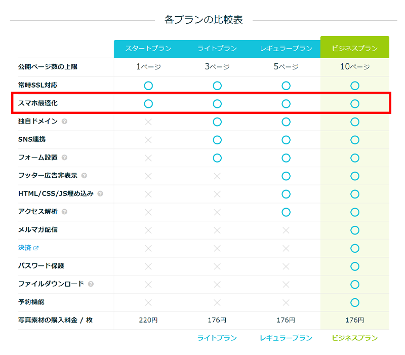 ▲ペライチの場合も全プランにスマホ最適化は含まれています