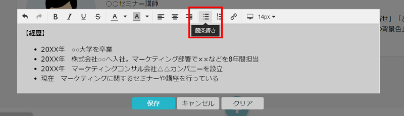 また、経歴を書く際は、テキスト編集欄にある「箇条書きボタン」を使うとより読みやすくなるのでおすすめです。