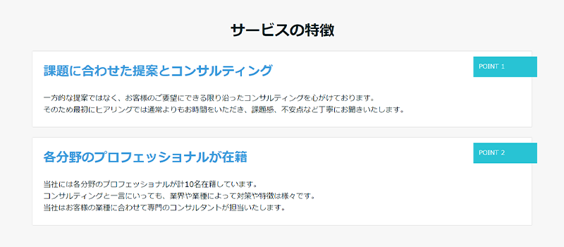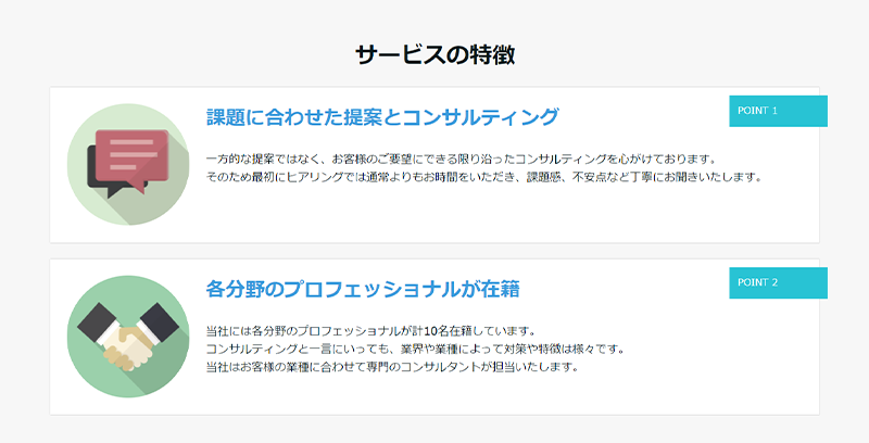 画像エリアを削除し、テキストだけにすることでポイント(サービスの特徴など)を紹介するコンテンツとして使うこともできます。コツは、小見出しの大きさや色が変えてメリハリを付けることです。