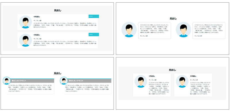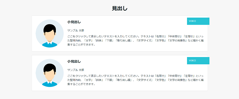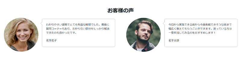 ブロック名の通り、お客様の声を紹介するコンテンツとしてご利用いただける他、工夫次第で講師などのプロフィール紹介やサービスの強みを伝えるためのポイント紹介としてもお使いいただけます。
