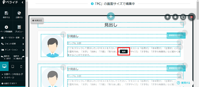 編集画面でテキスト欄にカーソルを合わせると「編集」という文字が出てくるのでそのままクリック。記入欄専用の編集画面が出てくるので任意のテキストを記入しましょう。