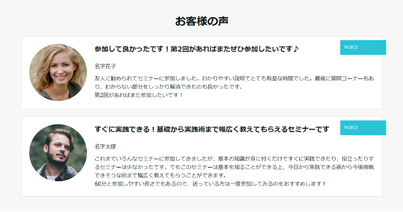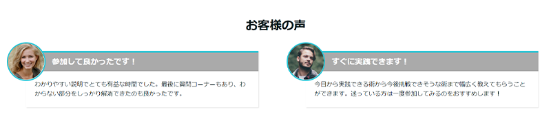 特にセミナーやサービス紹介のホームページで活躍するのが「お客様の声」ブロック。