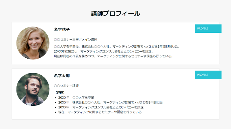 プロフィールの多くも「写真」「名前」「肩書」「経歴紹介」といったコンテンツで構成されていることが多いので、それに置き換えてテキストを記入すればプロフィールコンテンツのように使うことが可能です。