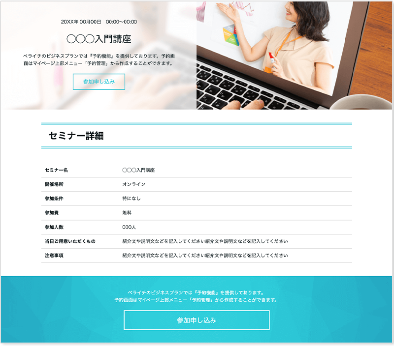 セミナー概要や内容紹介、お申し込みまでできるコンテンツを配置したテンプレートです。