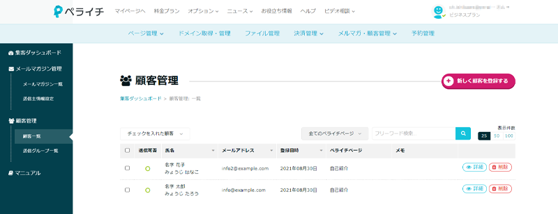 顧客管理ページは「マイページ」>「メルマガ・顧客管理」>「顧客管理」から確認・編集することができます。