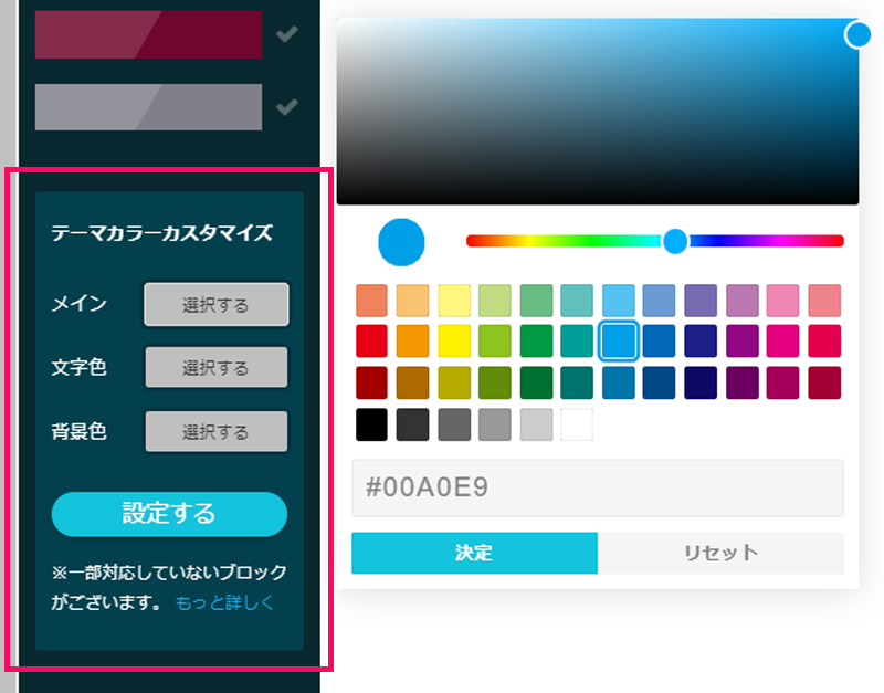 ペライチでは、5色のテーマカラー(あらかじめ配色が決められてるカラーセット)から色を選ぶほかにも、「テーマカラーカスタマイズ」でメイン・文字・背景の色を自由に設定することが可能です。色コード指定もできるので、微妙な色の違いも再現することができ、各ブロックの色も変えることもできます。