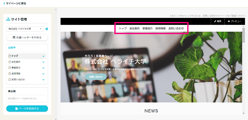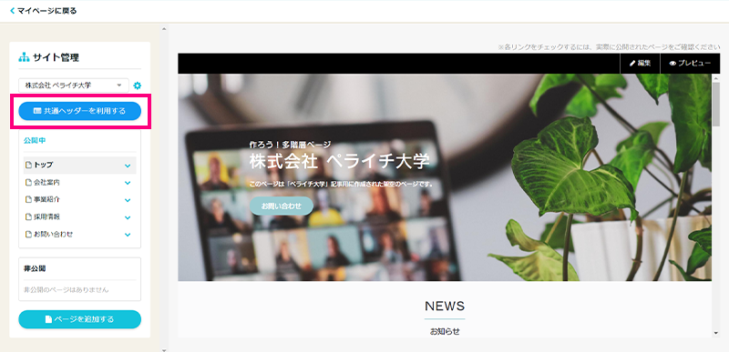 必要なページが揃ったら「共通ヘッダーを利用する」をクリックし、全ページ共通のヘッダーを表示させましょう。