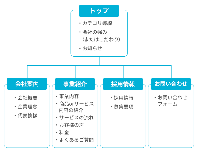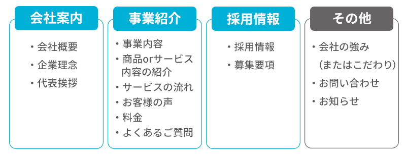 今回は「会社案内」「事業紹介」「採用情報」の3カテゴリと、一旦どこにも分類されない「その他」の4つで分けました。