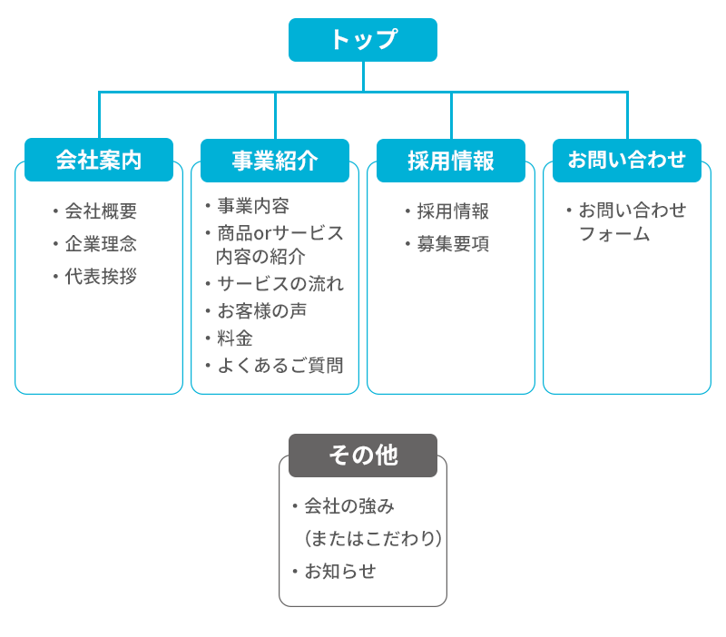 「その他」には、トップページに個別で入れたいコンテンツや独立ページにしたいもの、あるいは最後にどこに入れるか検討したいものなどを分類しておくと良いです。