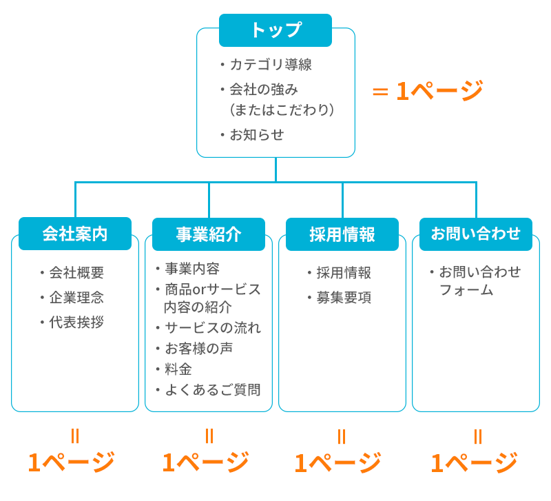 具体的には「トップページ」と「各カテゴリーページ」を1ページずつ用意するようにしましょう。
