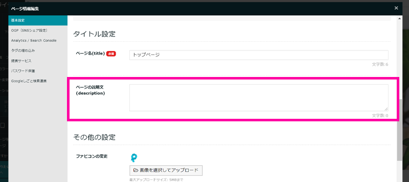 2.「タイトル設定」の中の「ページの説明文(description)」にテキストを記入
