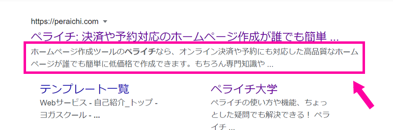サイト説明文とは、検索された際にホームページタイトルのすぐ下に表示される説明文のことです。「説明」という意味の「description(ディスクリプション)」または「meta description(メタディスクリプション)」と呼ばれることもあります。