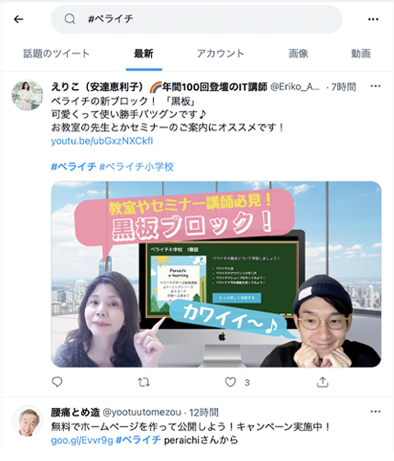 ▲#ペライチで検索。このタグがつけられたツイートのみが表示される