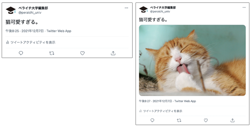 文章のみが基本のTwitterですが、その中で画像や動画が添付されているとそれだけで目を引くツイートにすることができます。