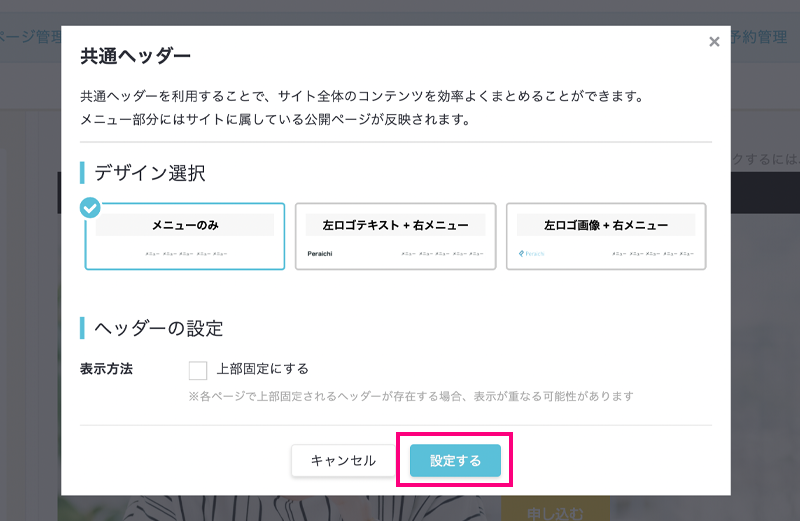 必要なページが揃ったら「共通ヘッダーを利用する」をクリックします。ヘッダーデザインと上部固定の有無が決められるモーダルが出てくるので、好きな設定にして「設定する」をクリック。