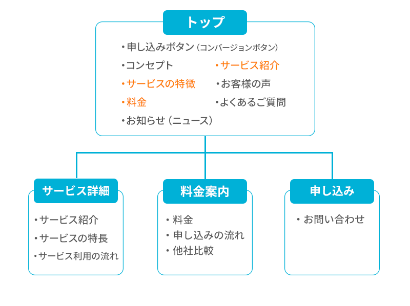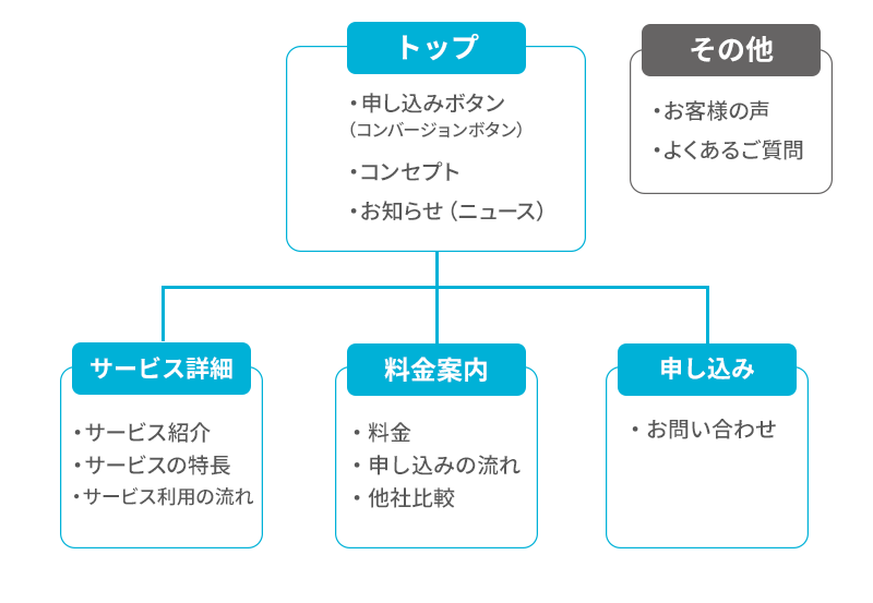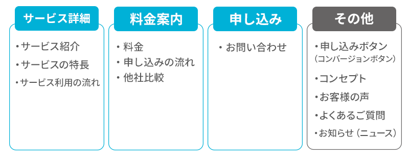 今回は「サービス詳細」「料金案内」「申し込み」の3カテゴリと、一旦どこにも分類されない「その他」の4つで分けました。