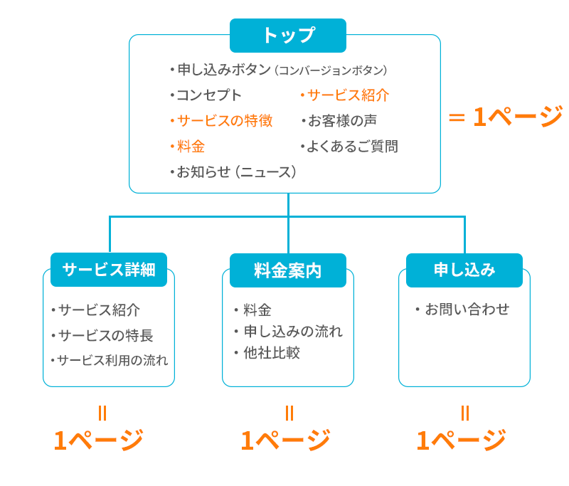 なので、各詳細ページは作りつつ、トップでサービス紹介や料金など重要な情報が伝わるような作りにするのがおすすめです。