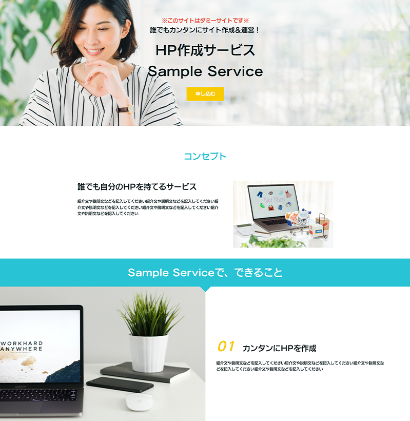 今回はペライチテンプレートを作る際の構成を参考に「サービスサイトのおすすめコンテンツ」をご用意しましたので、こちらを例にホームページ作成方法をお伝えしていきます^^