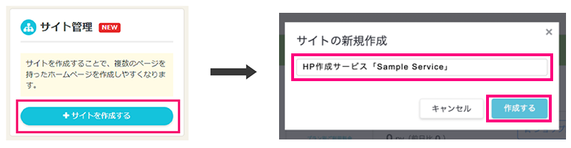 「サイト管理機能」欄にある「+サイトを作成する」をクリックし、サイト名を決めましょう。サイト名は後から編集もできますので、決まっていない場合は仮で入力しておいても大丈夫です。