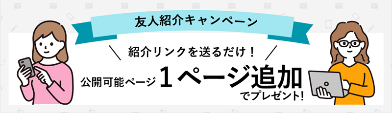 1名新規登録につき公開ページを1ページ追加される友人紹介キャンペーンがよりわかりやすくリニューアル!