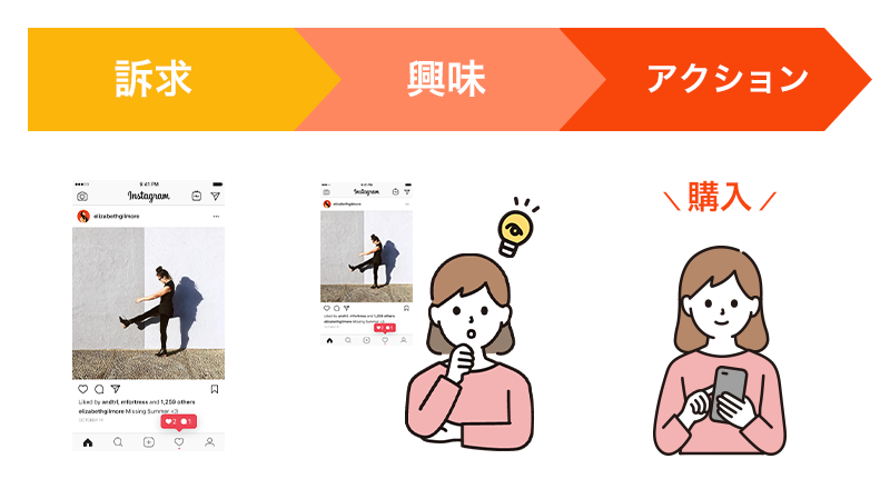 また、それらがインスタの投稿と組み合わさることで、「投稿による訴求」→「ユーザーが興味を持つ」→「購入や申し込み」といった一連の消費行動をインスタ内で完結することができます。