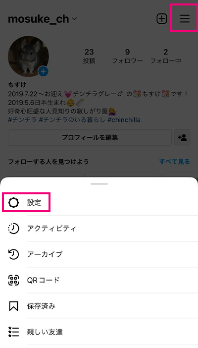 1.プロフィールで「三」をクリックし、「設定」を開く
