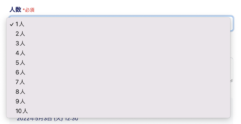 複数人予約受付の設定すると予約者の画面に人数選択の項目が表示されるようになる