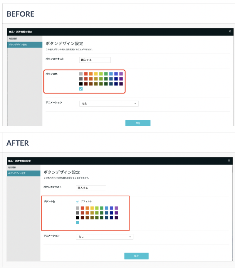 これまでいずれかの色を選択しなくてはいけなかった決済ブロックのボタンに「デフォルト」が登場!