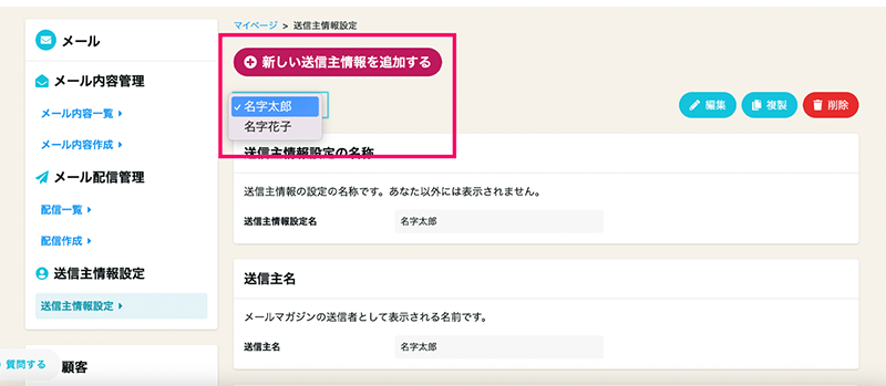 送信者は名前だけでなく、送信者の情報や問い合わせ先なども個別に設定ができます。