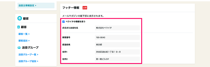 【変更点④】フッター情報の住所にペライチの住所が選べるように