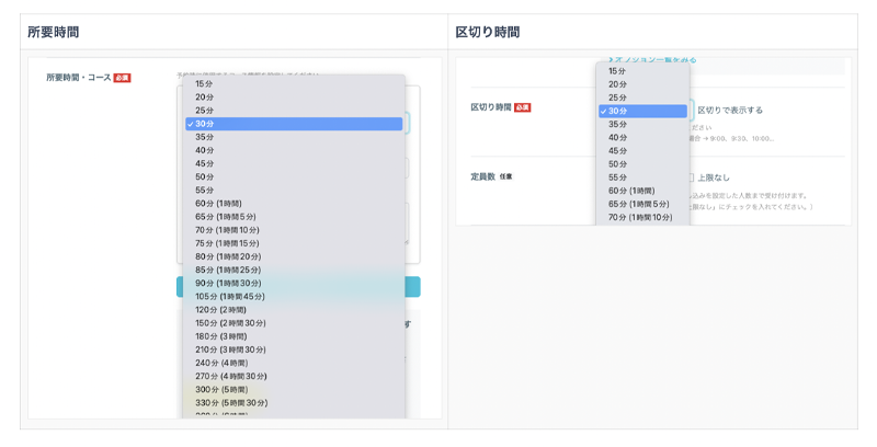 受付時間を区切る「区切り時間」と予約内容にかかる時間の「所要時間」がそれぞれ5分区切りで設定できるようになりました!