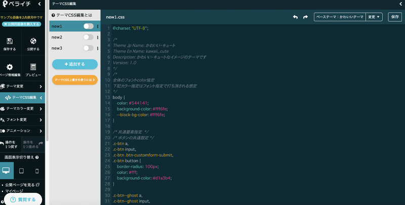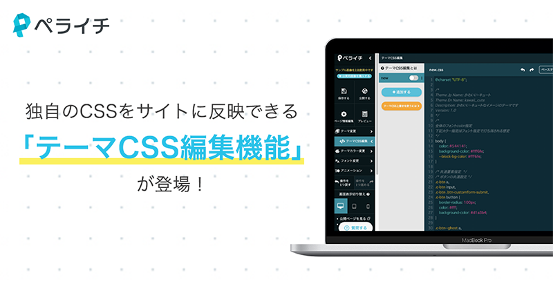 編集するCSSは『ペライチ』で提供している「テーマ変更機能」で使用されているデータをベースとして作成することができ、CSSに詳しくない方でも編集しやすい仕様になっています^^