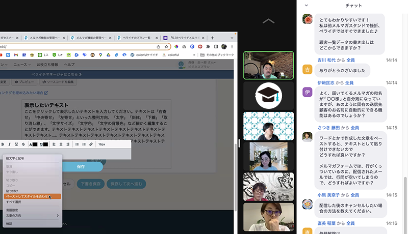 大人数のZOOMだと発言するのにも勇気がいるので、気になったタイミング&チャットで気軽に質問できるのはうれしいポイント!
