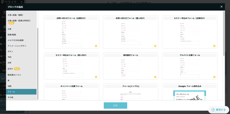 ▲サイト編集画面で好きなフォームブロックを挿入