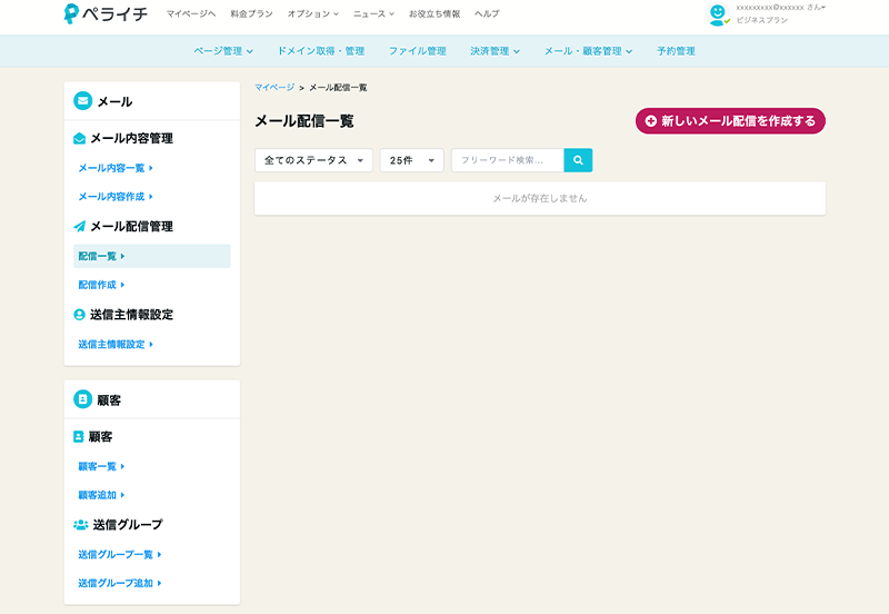 「マイページ」上部の「メール・顧客管理」をクリックして、メルマガ管理画面に移動します。