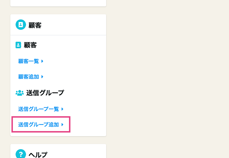 左メニューの下部にある「顧客」欄にある「送信グループの追加」をクリック。