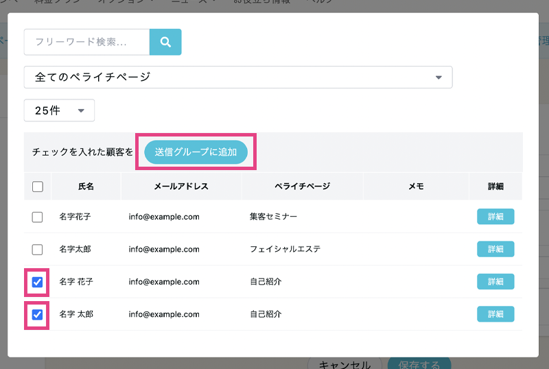 任意のグループ名を記入したあと、「個別に顧客を追加」をクリックすると、フォーム・予約・決済を通じてメルマガを購読した顧客一覧が表示されるので、送信したい人に全てチェックを入れて「送信グループに追加」をします。