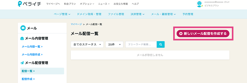 メルマガ管理画面トップに戻り、右上にある「新しいメール配信を作成する」をクリックして、メール作成画面を開きます。